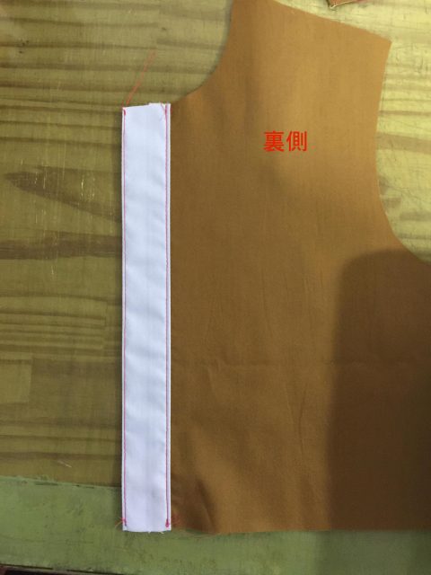見返し部分に芯貼ります。(生地によっては前立てになる所まで貼ってもいいです。生地の厚みによる。)