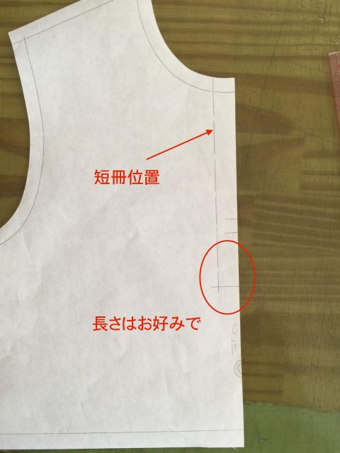 向かって右側の丈が短い方。 下端の位置は切り込み止まり位置と同じ長さにしてください。