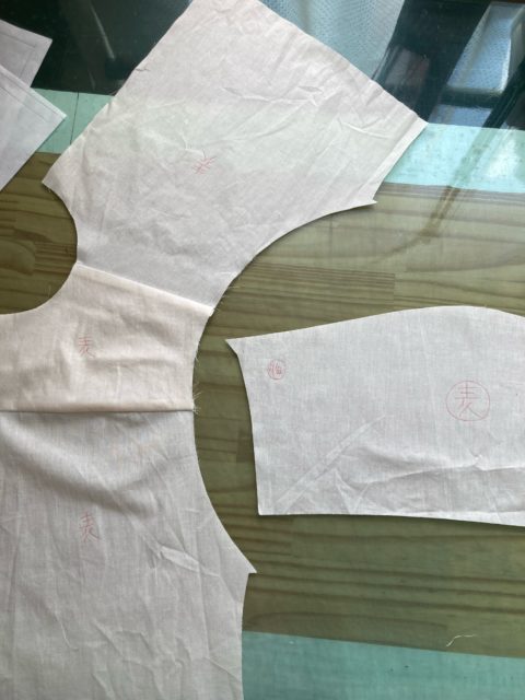 シャツなので袖ぐりの縫い代は基本、身頃高片倒し。