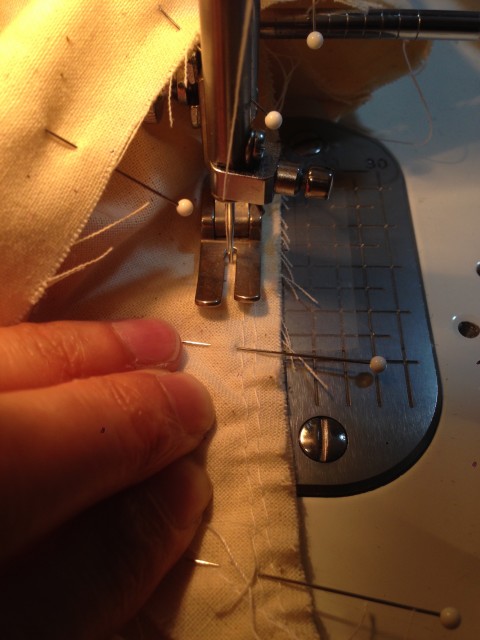 慣れてない人はピンが邪魔で縫いにくいと思うから、この後しつけ糸でしつけ縫いすると楽に縫えるよ。