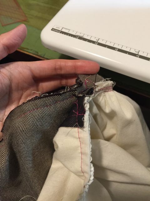 表地にヘリンボーン生地使ってます。しかも、どうしても生地が足りなくって見返し横地で裁断してます。許されないけど許してください。