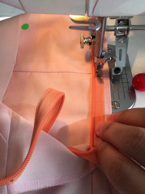 ③裾を半分くらい縫った所で、一旦糸を切ってミシンから外し、再度出来上がりの状態に整える(裾の半分が縫われている状態で表地、裏地がそれぞれ外表になっている)